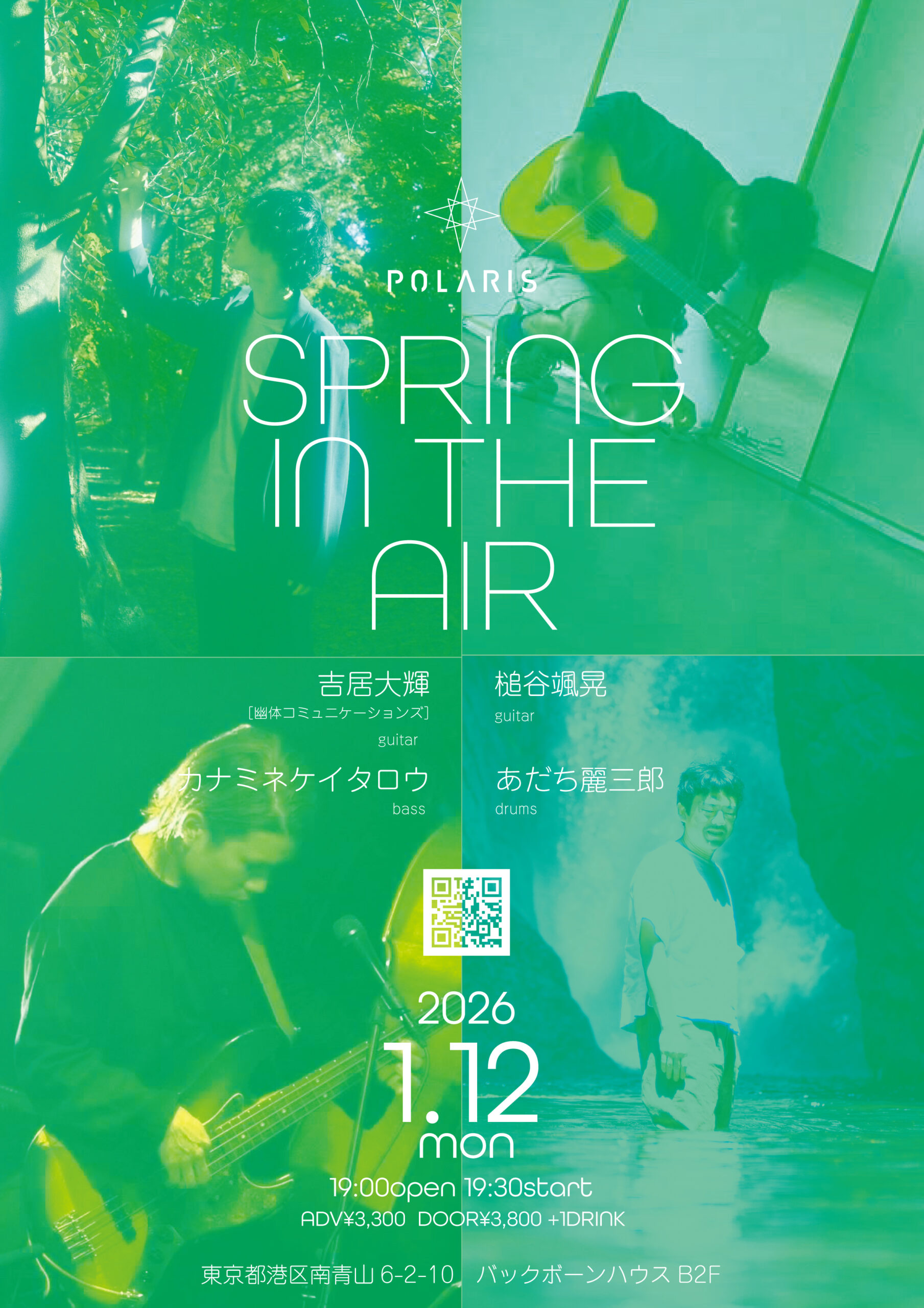01/12 MON SPRING IN THE AIR OPEN/START 19:00/19:30 ACT : 吉居大輝[幽体コミュニケーションズ]guitar 、槌谷颯晃 guitar、カナミネケイタロウ bass、あだち麗三郎 drums