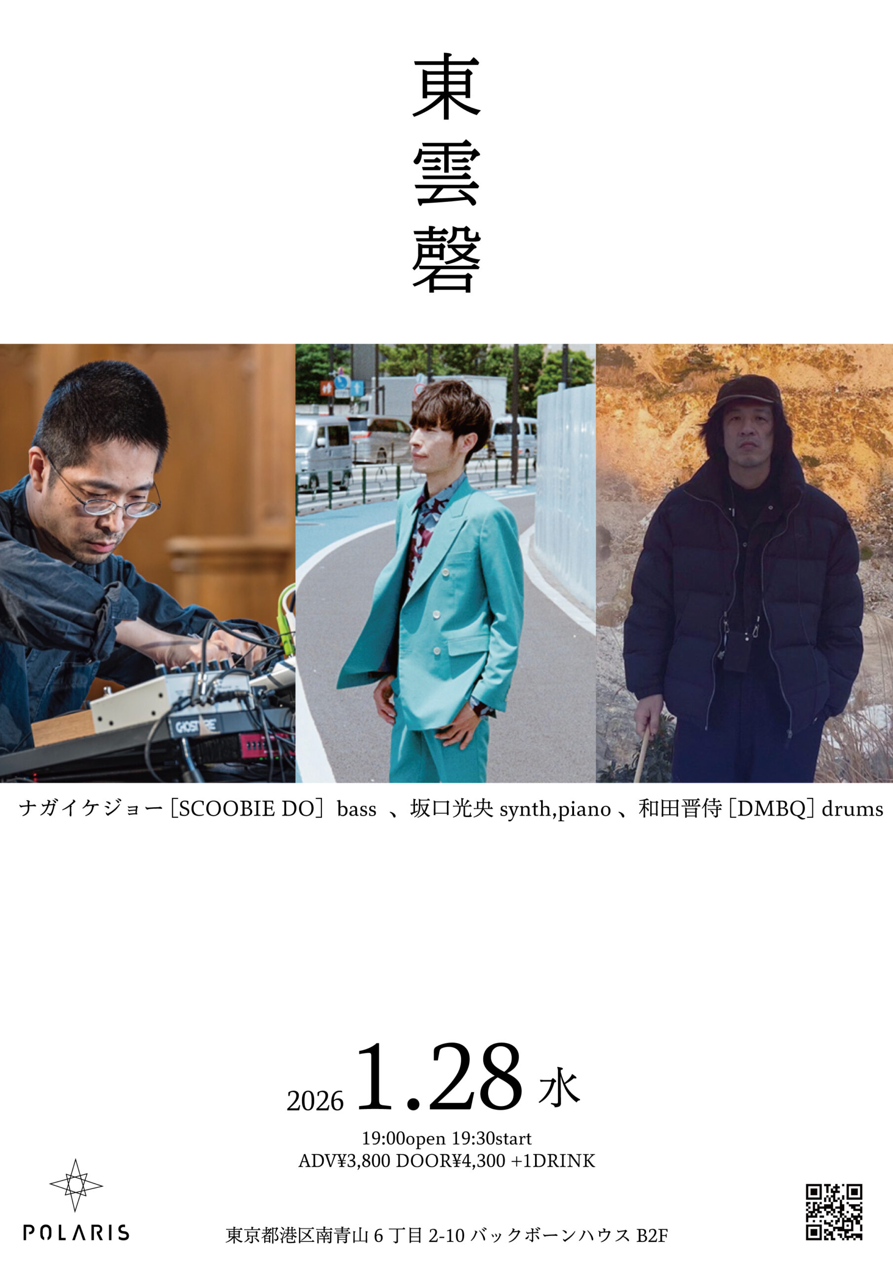01/28 WED 東雲磬 OPEN/START 19:00/19:30 ACT : ナガイケジョー[SCOOBIE DO] bass 、坂口光央 synth,piano 、和田晋侍[DMBQ] drums