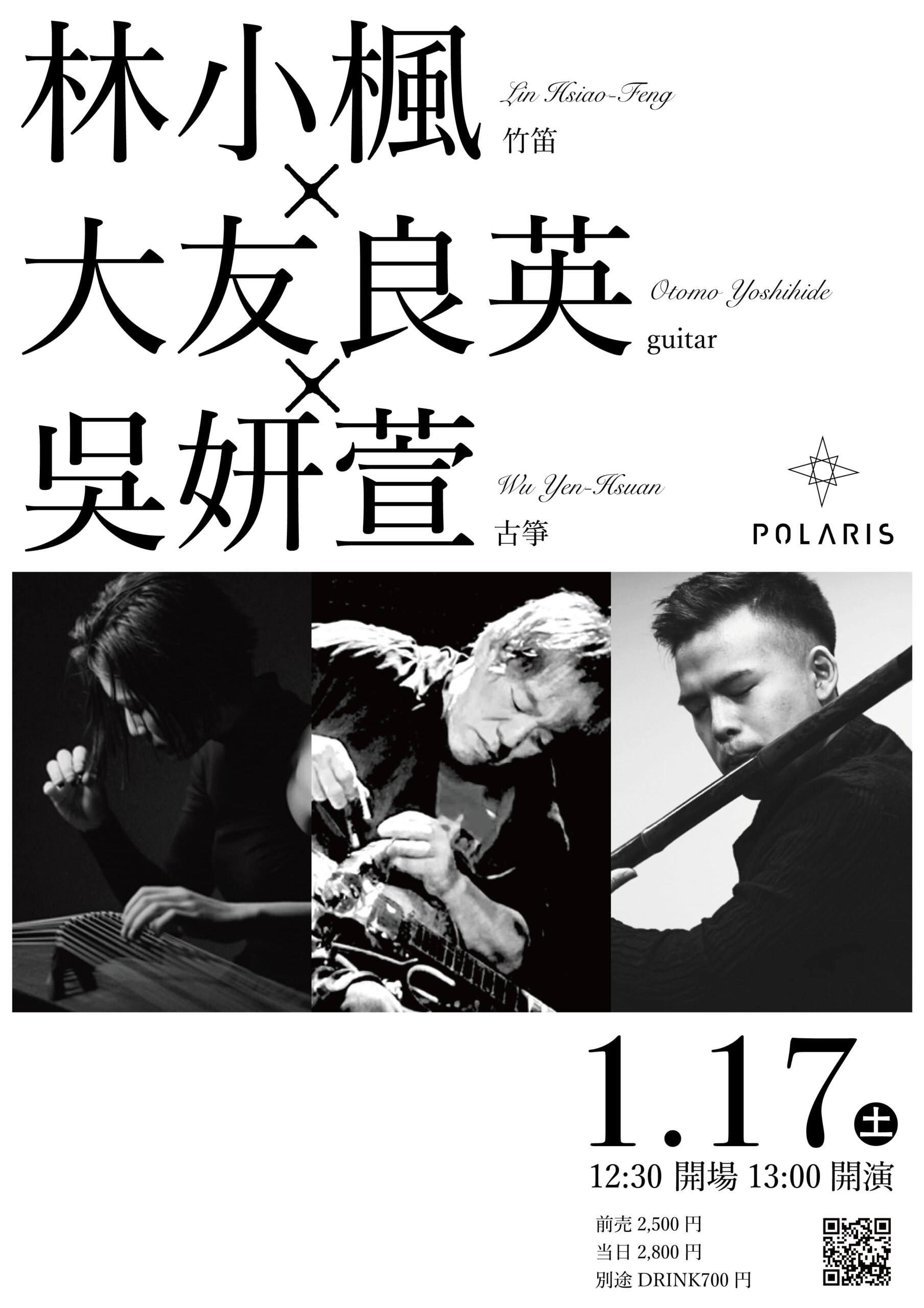 01/17 SAT 林小楓 × 大友良英 × 吳妍萱 OPEN/START 12:30/13:00 ACT : 林小楓 Lin Hsiao-Feng(竹笛)、大友良英 Otomo Yoshihide(guitar)、吳妍萱 Wu Yen-Hsuan(古箏)