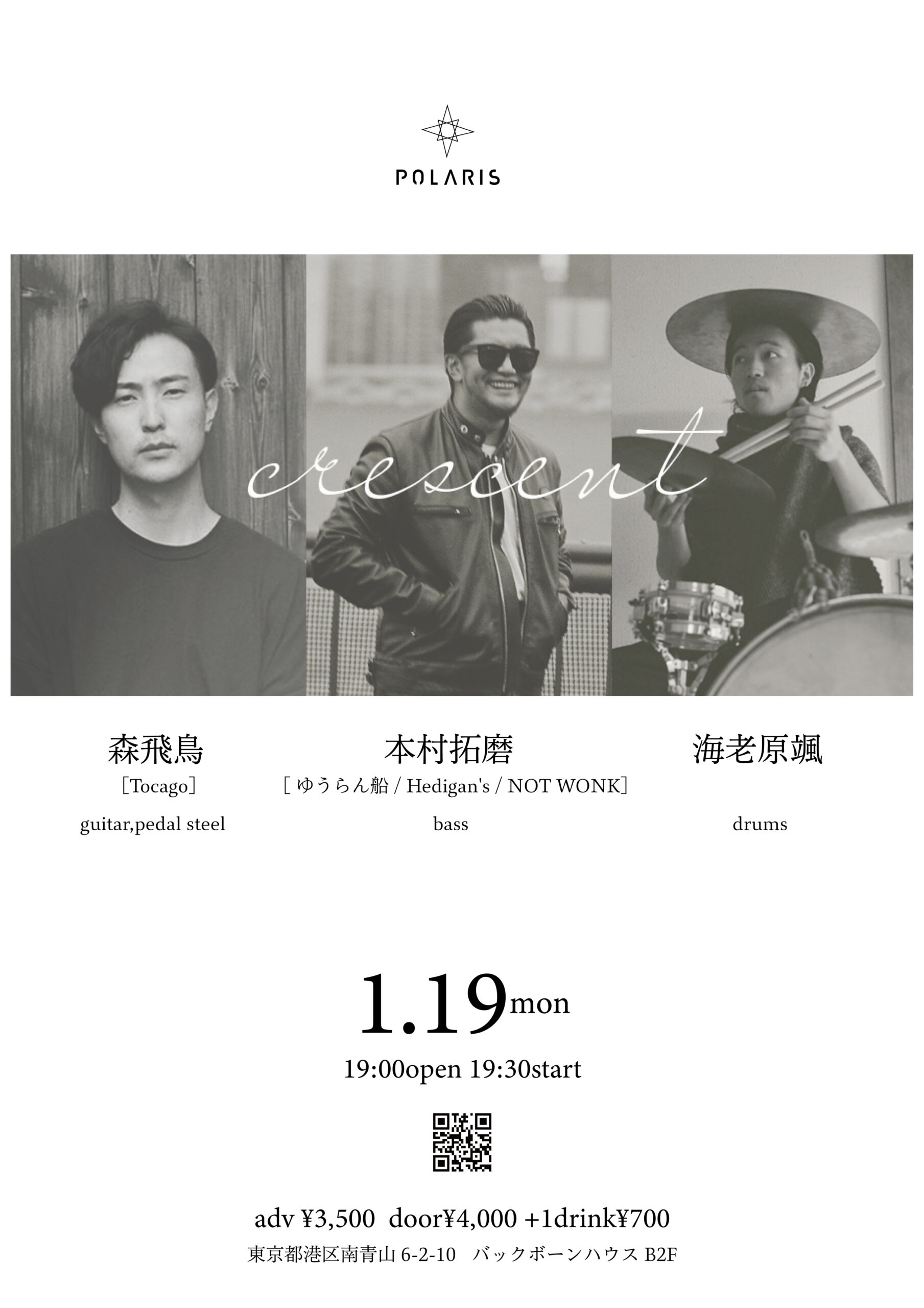 01/19 MON crescent OPEN/START 19:00/19:30 ACT : 森飛鳥 [Tocago] guitar,pedal steel、本村拓磨 [ゆうらん船 / Hedigan's / NOT WONK]bass、海老原颯 drums