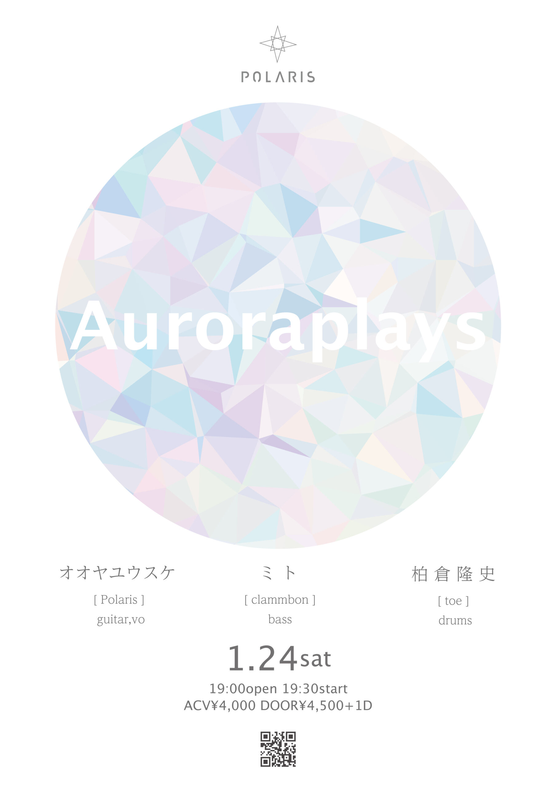 01/24 SAT Auroraplays OPEN/START 19:00/19:30 ACT : オオヤユウスケ [Polaris] guitar,vo、ミト [clammbon] bass、柏倉隆史 [toe] drums