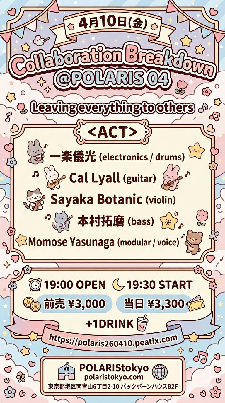 04/10 FRI Collaboration Breakdown @POLARIS 04 OPEN/START 19:00/19:30 ACT : 一楽儀光(electronics / drums)/ Cal Lyall (guitar) / Sayaka Botanic (violin) / 本村拓磨(bass)/ Momose Yasunaga (modular / voice)