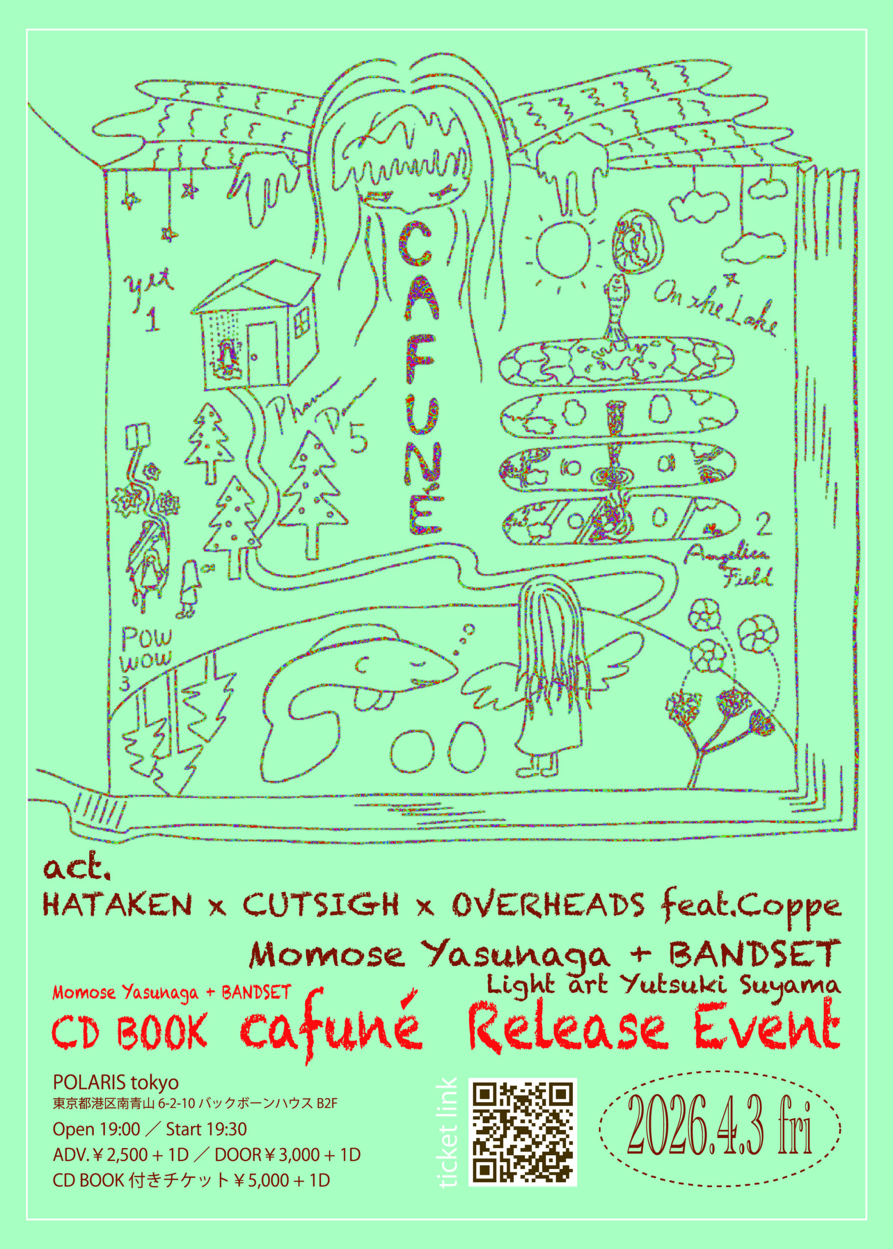 04/03 FRI Momose Yasunaga + BAND SET 「cafuné」Release Event OPEN/START 19:00/19:30 ACT : HATAKEN × CUTSIGH × OVERHEADS feat. Coppé / Momose Yasunaga + BAND SET Light art:Yutsuki Suyama