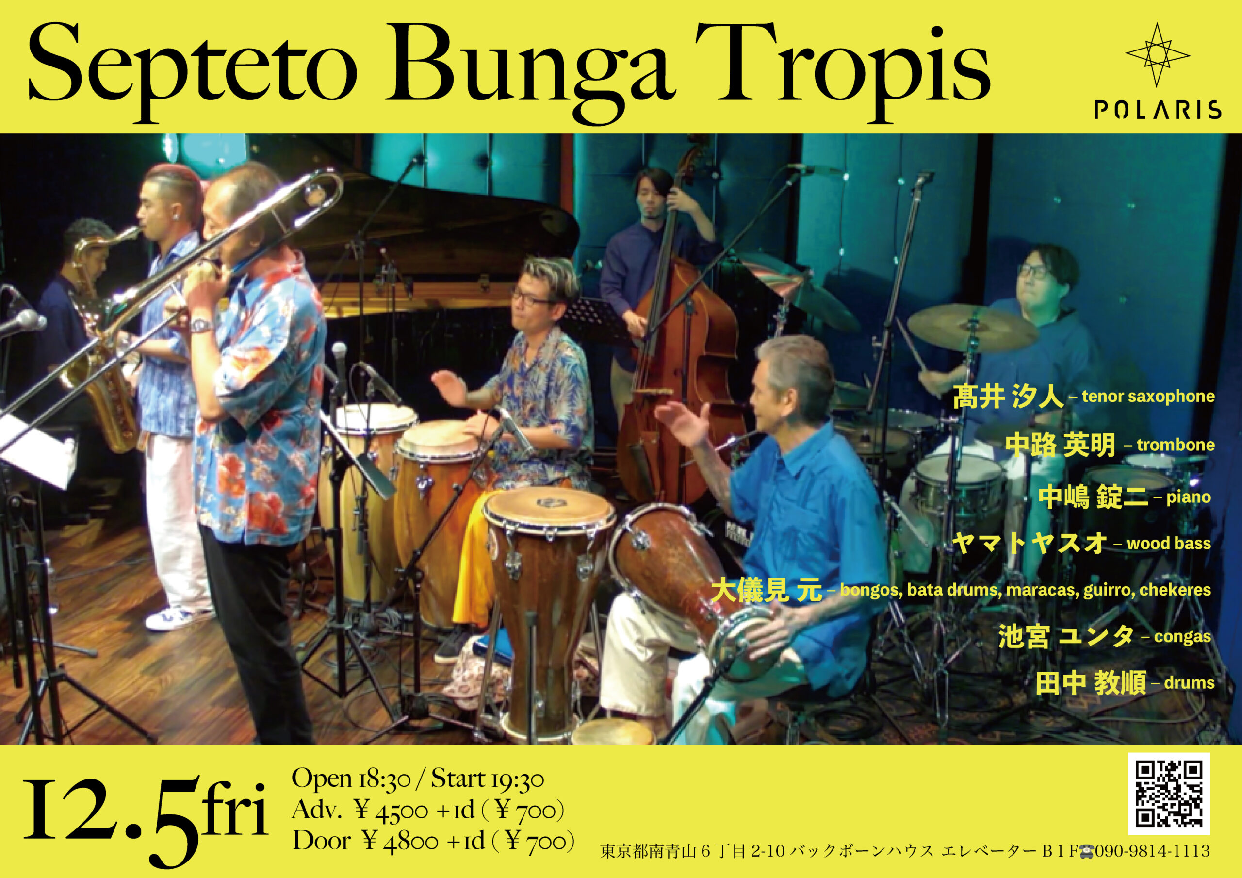 ACT : 髙井 汐人 – tenor saxophone、中路 英明 – trombone、中嶋 錠二 – piano 、ヤマトヤスオ – wood bass 、大儀見 元 – bongos, bata drums, maracas, guirro, chekeres 、池宮 ユンタ – congas 、田中 教順 – drums