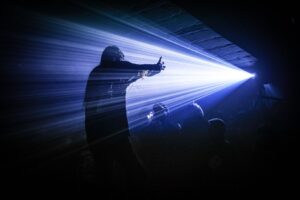 このプロジェクトではリズム構造がしばしば解体され、音は構築物ではなく力として現れる。観客は音の内部へと沈み込む感覚を味わい、原始的なトランス感と未来的な異物感が交差する時間が生まれる。そして、多層的に投入されるサンプルコラージュにより、意味の断片や音の残響が渦を巻き、混沌が儀式のような強度を帯びて増幅していく。