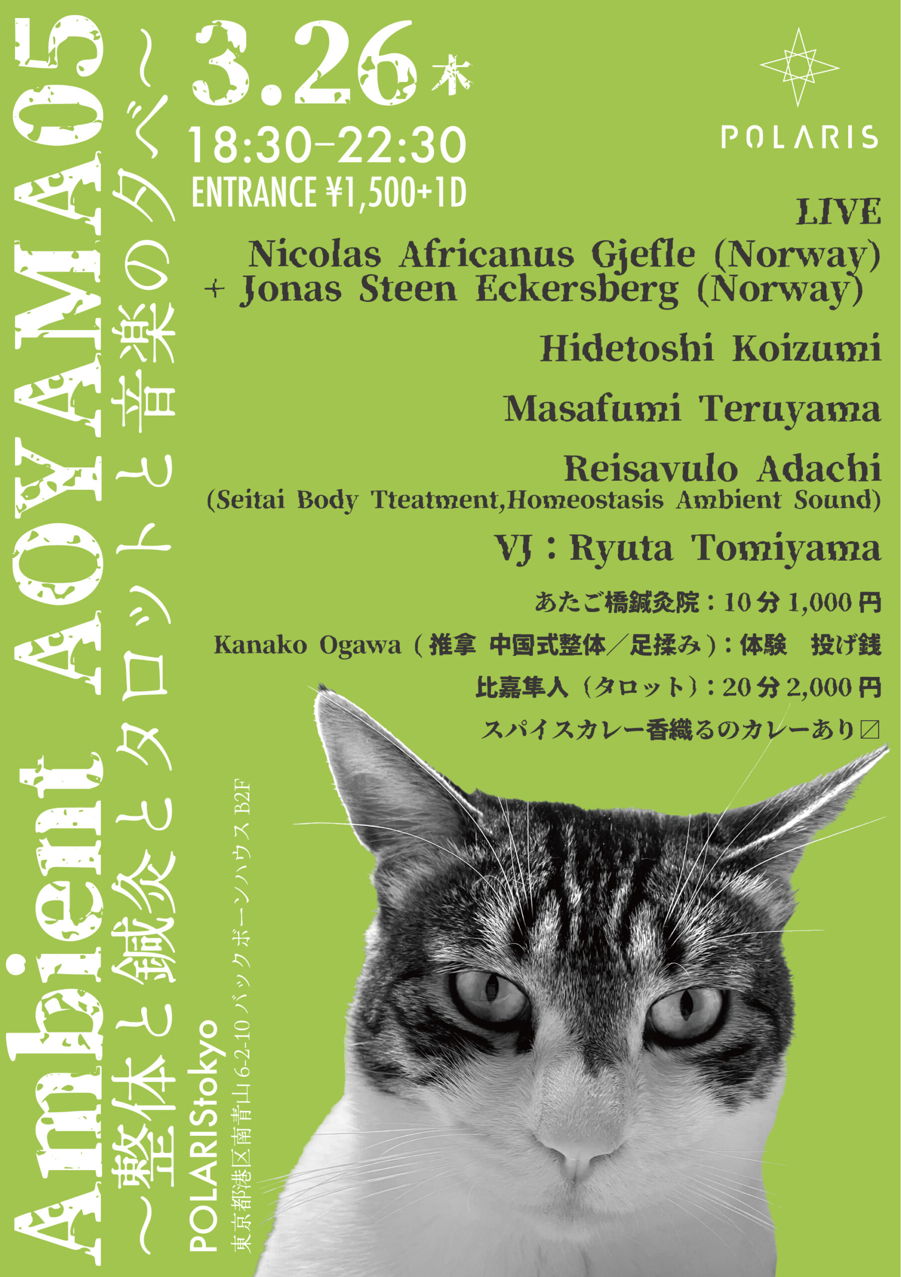 ACT : Nicolas Africanus Gjefle (Norway) + Jonas Steen Eckersberg (Norway) / Hidetoshi Koizumi / Masafumi Teruyama / Reisavulo Adachi(Seitai Body Tteatment,Homeostasis Ambient Sound) VJ:Ryuta Tomiyama、あたご橋鍼灸院(鍼灸)、Kanako Ogawa (推拿 中国式整体/足揉み)、比嘉隼人(タロット)