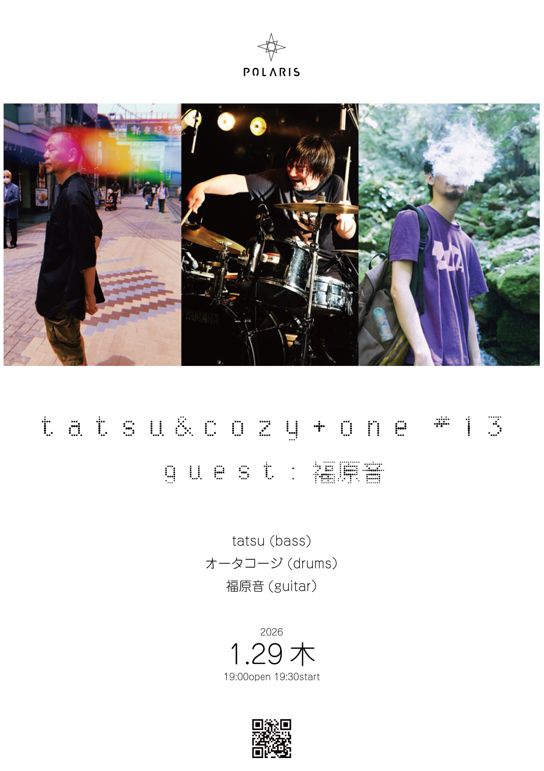 01/29 THU tatsu&cozy+one #13 guest:福原音 OPEN/START 19:00/19:30 ACT : tatsu (bass)、オータコージ (drums)、福原音(guitar)