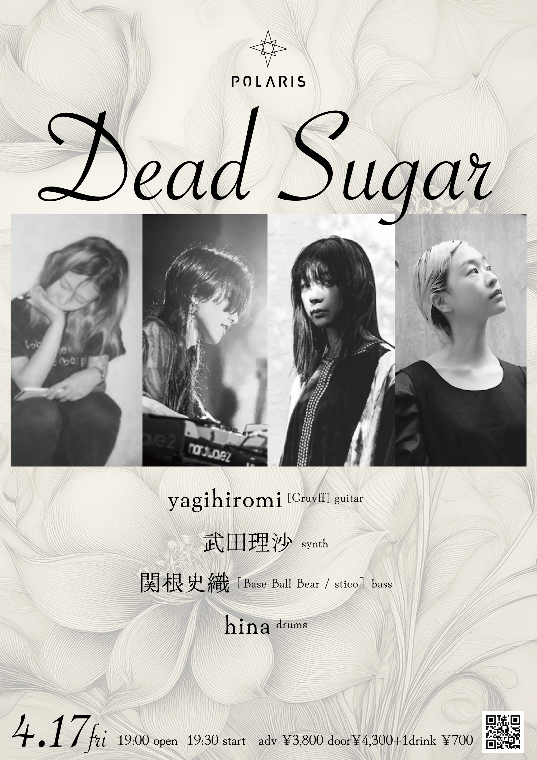 04/17 FRI Dead Sugar OPEN/START 19:00/19:30 ACT : yagihiromi [Cruyff] guitar、武田理沙 synth、関根史織[Base Ball Bear / stico]bass、hina drums