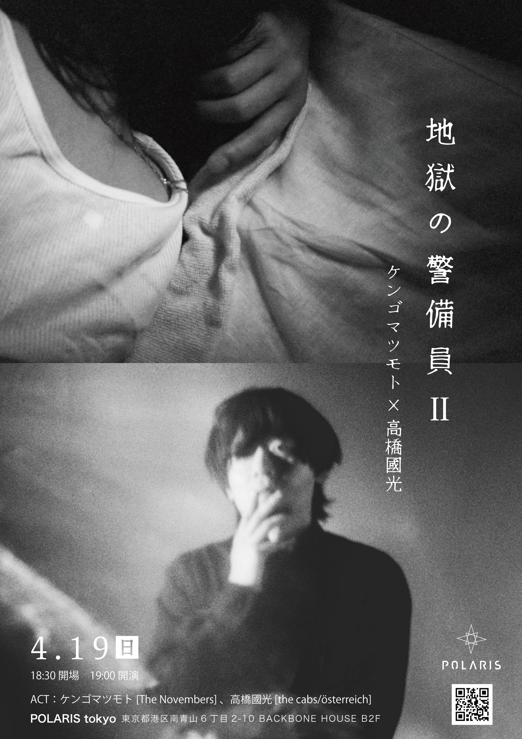 04/19 SUN 地獄の警備員II (ケンゴマツモト×高橋國光) OPEN/START 18:30/19:00 ACT : ケンゴマツモト[The Novembers] 、高橋國光 [the cabs/österreich]